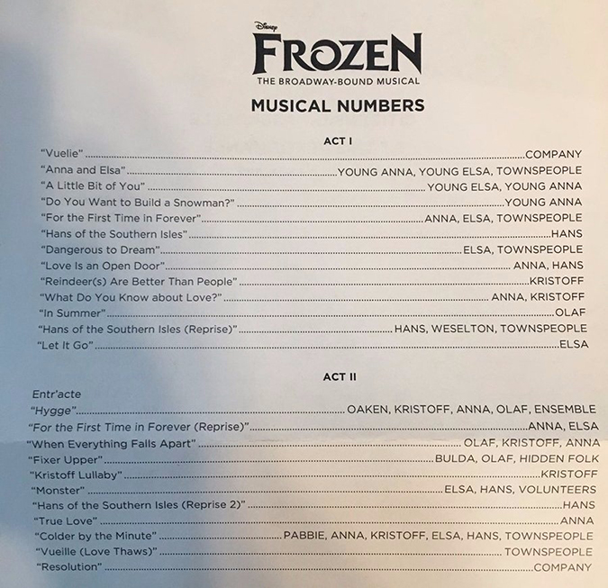 Благодаря ранней премьере в Денвере стал известен полный список песен и композиций, которые прозвучат в мюзикле "Холодное Сердце".