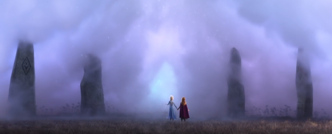 Во вторых нам показали таинственные каменные стелы с символами четырёх элементов стихий. Кажется, что в этом кадре Эльза с помощью своей магии открыла портал.