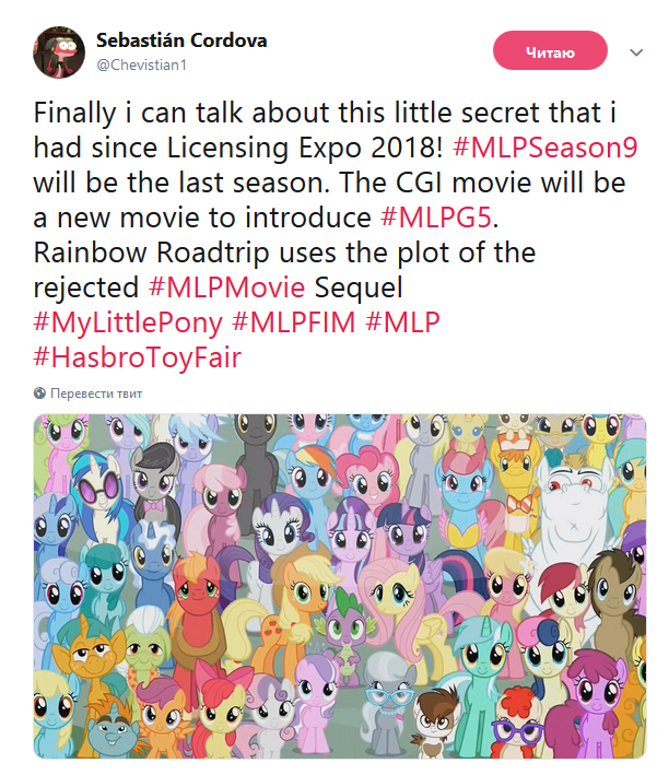 "Наконец-то я могу поделиться секретами, которые я узнал еще на Licensing Expo 2018! #MLPSeason9 будет последним сезоном. CGI мультфильм будет новым мультфильмом, представляющим публике пятое поколение пони #MLPG5. В спешале Rainbow Roadtrip будет использован сценарий отвергнутого продолжения мультфильма "Мой Маленький Пони в Кино" #MLPMovie Sequel #MyLittlePony #MLPFIM #MLP #HasbroToyFair".