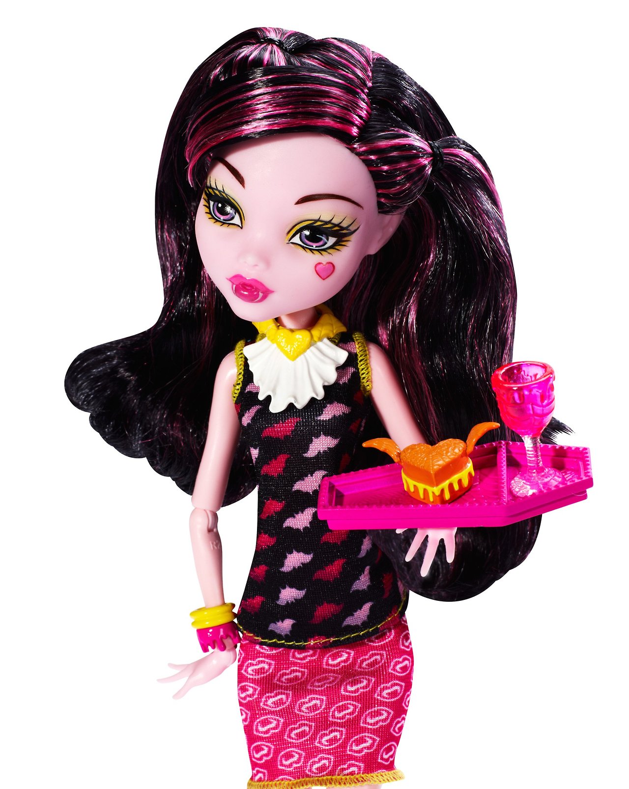 Со всеми куколками в комплекте идут цветные подносы с едой и напитком. В целом, серия получилась яркая и позитивная. У всех монстряшек в волосах появились цветные пряди. Особенно красиво смотрися прическа Хоулин Вульф с ее длинными выпрямленными волосами розового цвета и фиолетовыми прядями. Но Дракулауре и Клео де Нил их прически конечно же тоже идут.