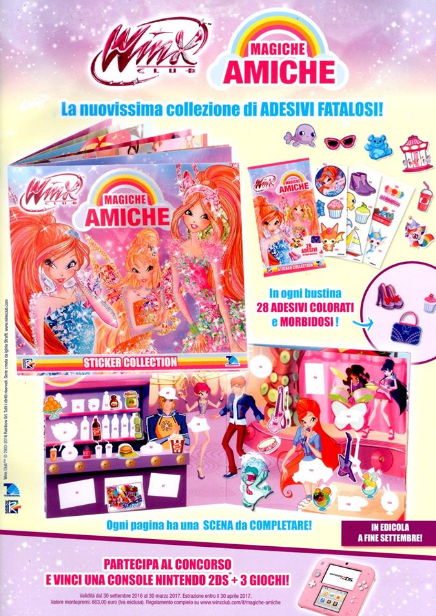 Также в журнале анонсировали еще одну очень интересную новинку - альбом для наклеек Winx Magiche Amiche (Винкс Волшебные Подруги). Этот альбом интересен тем, что все наклейки для него фигурные, и с их помощью нужно будет закрыть пропуски на разворотах с картинками. Каждый пакетик наклеек содержит в себе 28 фигурных наклеек.