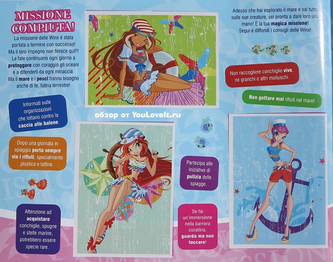 Winx Missione Oceano - альбом для коллекционирования наклеек. 196 основных наклеек и 18 специальных для внутреннего постера. Постер двусторонний, с одной стороны изображения Винкс Сиреникс в 3 D, с другой морские существа на фоне картинок Винкс в нарядах для путешествия по морю на яхте.