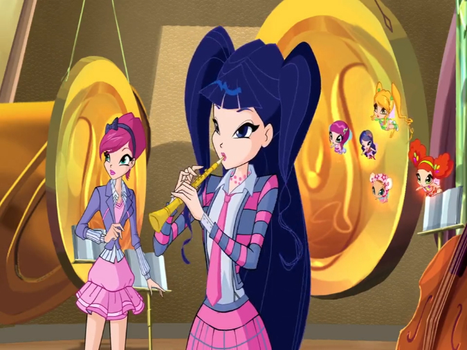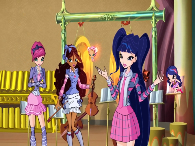 В Золотой Аудитории Винкс и пикси изучают знаменитые магические инструменты и слушают небольшой импровизированный концерт.