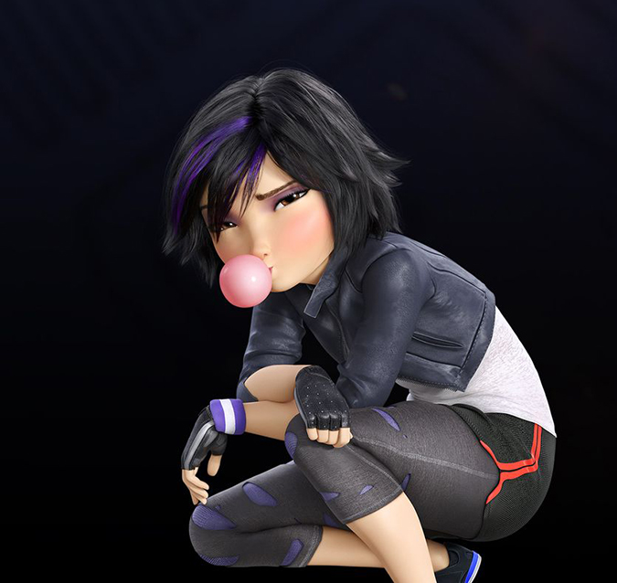 Го Го Томаго - самая независимая и самостоятельная девушка в команде, в принципе ее можно назвать самой самостоятельной. Она изобрела замечательный мотоцикл на левитационной подушке, который Хиро переделал в ее супер костюм. Го Го Томаго может перемещаться на дисках костюма, а также бросать их как оружие при необходимости. Но остановимся немножко на внешности этой героини. Кого же она напоминает? Возможно ее взгляд покажется тебе знакомым? Неужели он похож на взгляд Эльзы? Действительно очень похож.
