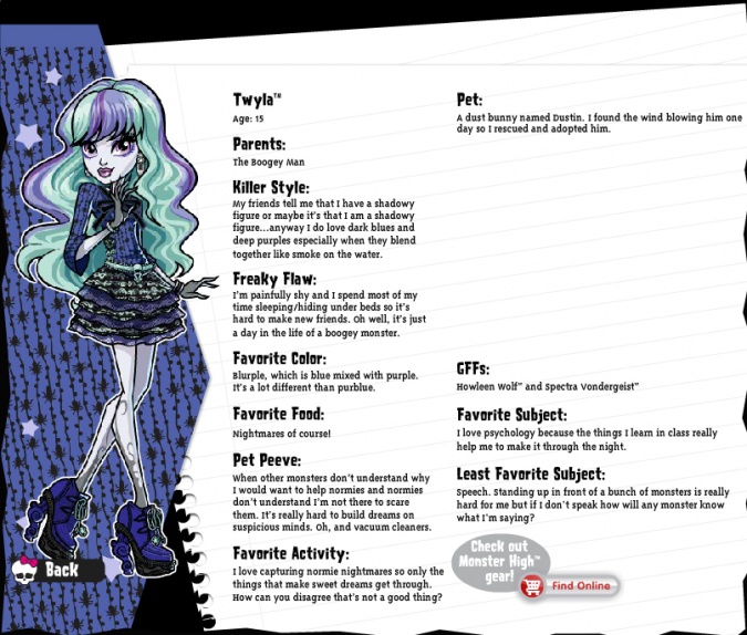 Странная особенность: Я очень стеснительная и провожу большую часть времени под кроватями, ожидая появления кошмаров, так что мне тяжело заводить новых друзей.