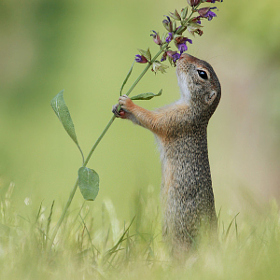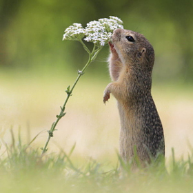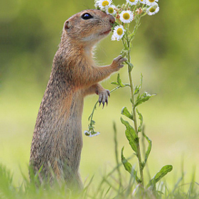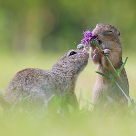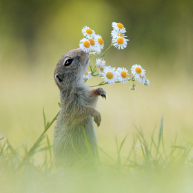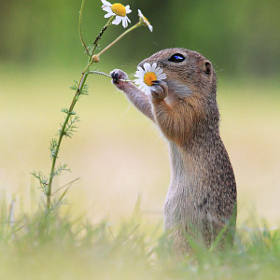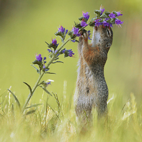 На самом деле и луговые собачки и хомячок грызут растения, но фотографу удалось поймать очень удачные кадры, на которых создается впечатление что животные подошли к растению просто чтобы понюхать его.