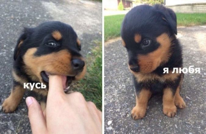 Собаки (особенно щенки) очень любят делать «кусь». У нас есть фото доказательства: