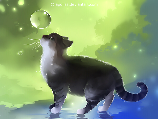 Автор этих картин нашел свой уникальный подход к рисованию пространства и самого объекта рисунка. Его работы полны тумана, капелек воды и пузырьков воздуха. Очень часто кажется, что котята смотрят на нас из-за стекла.