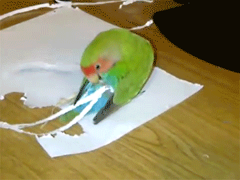 Этот попугай решил сделать свой хвост длиннее с помощью полосок белой бумаги.