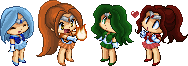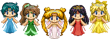 Пиксельные спрайты воительниц Сейлормун в различных версиях и превращениях.