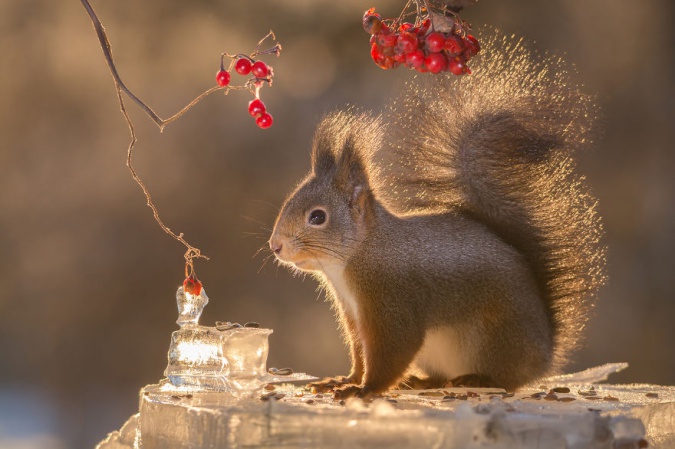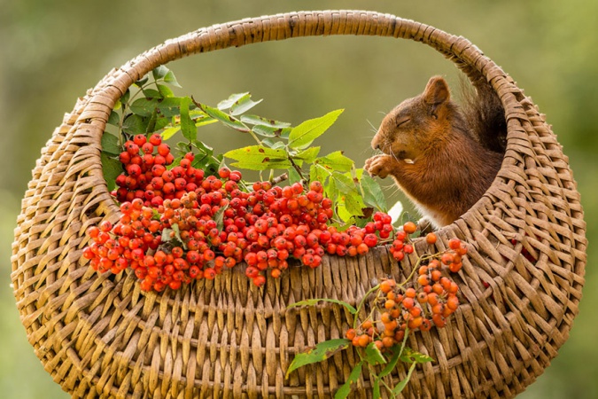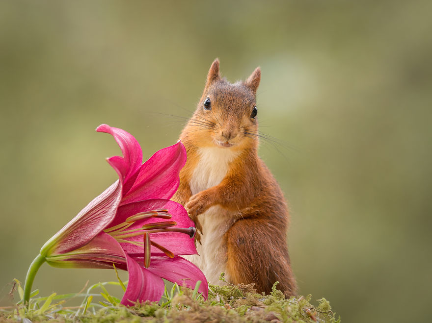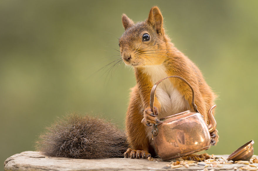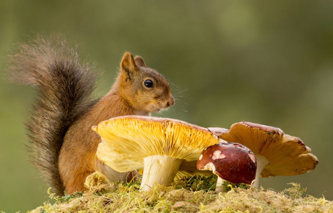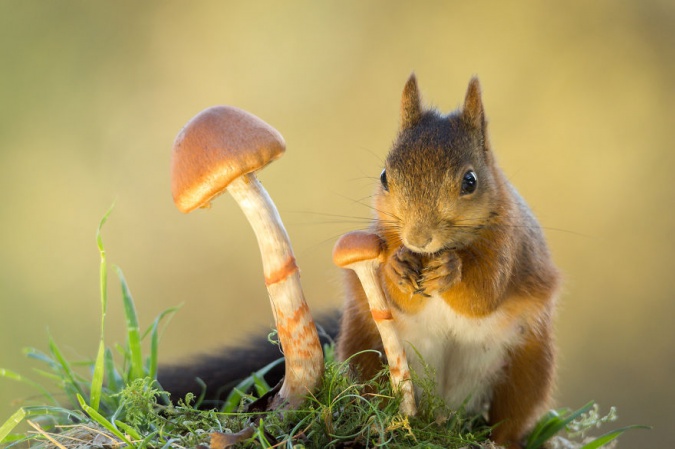 Хоть и кажется, что эти фотографии были сделаны в лесу, на самом деле они были сделаны рядом с домом фотографа. Автор фотографий соорудил открытую студию рядом с окном кухни, в которую он приманивает едой белок и птиц. И он же украшает это место бревнышками, мхом, грибами, и на фотографиях создается впечатление, будто белки находятся в лесу. А фотографу же удается фотографировать белок на уровне глаз.
