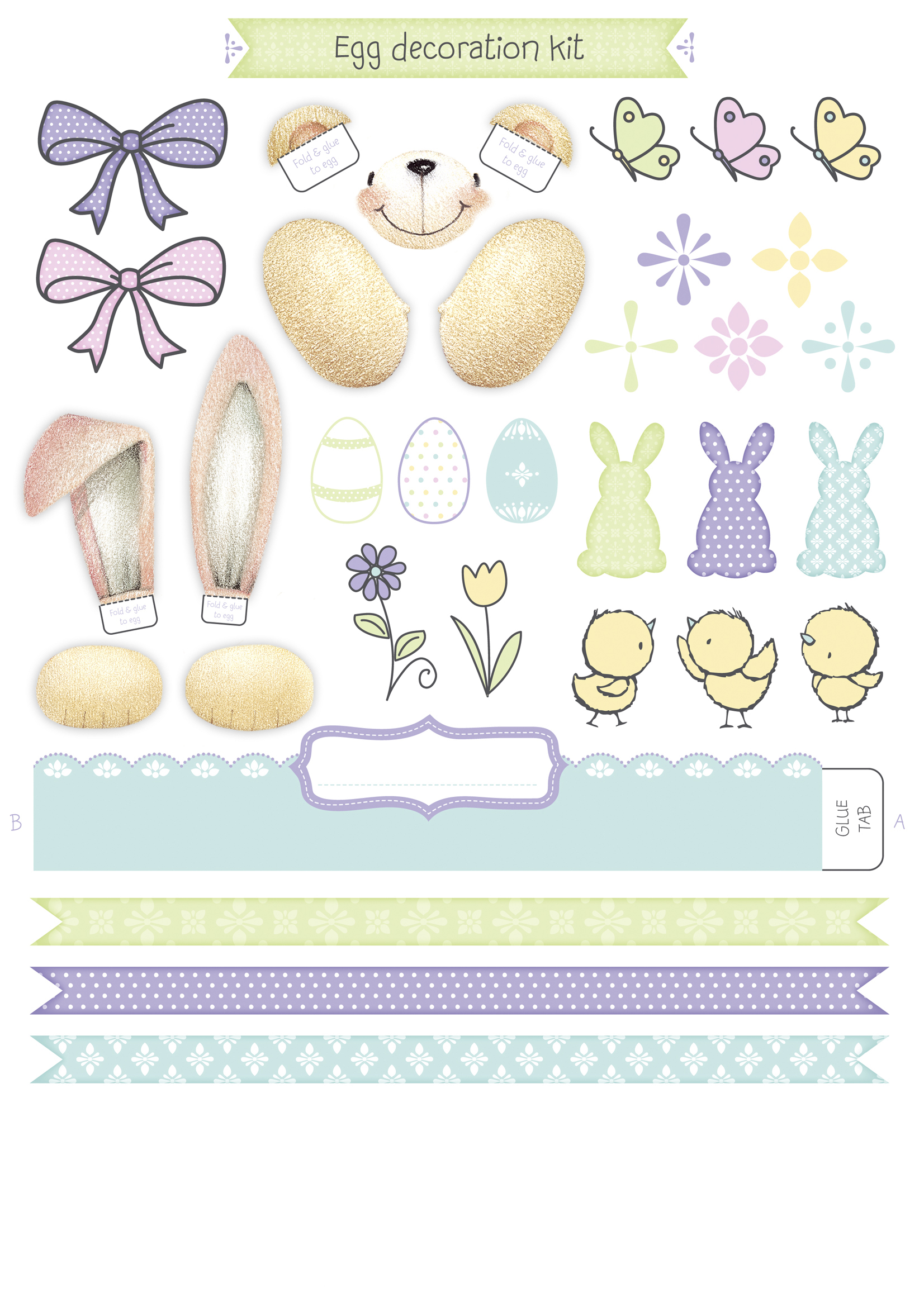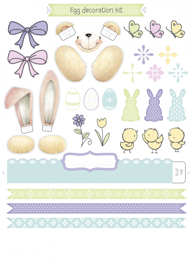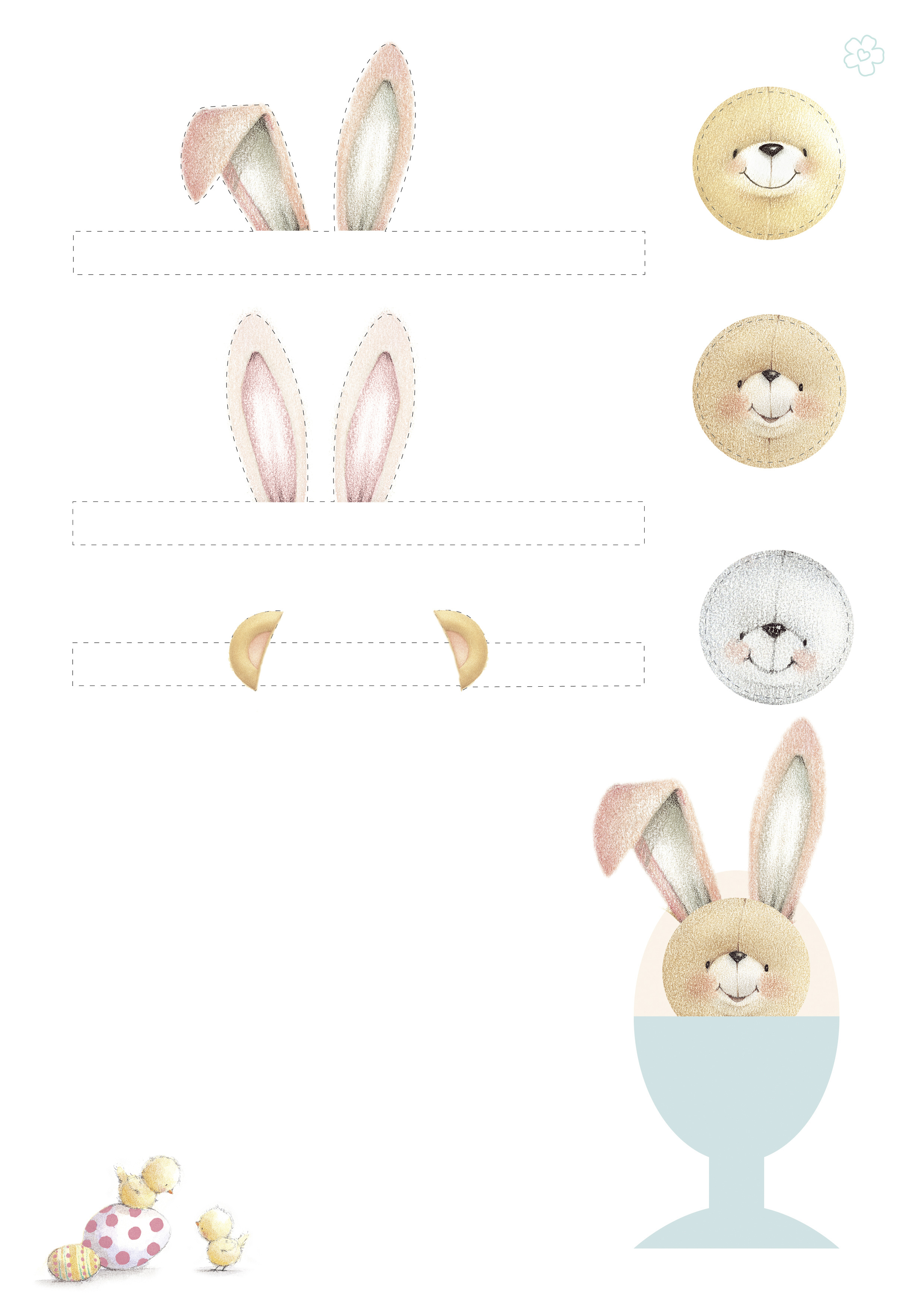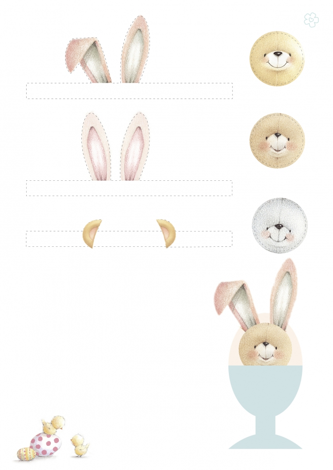 Используйте эти распечатки для украшения яиц на Пасху. Например, вы можете распечатать и вырезать мордочки мишек, приклеить их и к ним приклеить кроличьи ушки. Также в наборе распечаток есть и подставка, в которой пасхальные яйца будут красиво стоять.