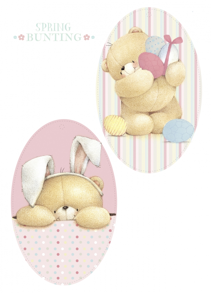 Также вы можете распечатать овальные картинки с пасхальными мишками Forever Friends, проделать в их верхней части дырочки и подвесить их за ленточки в доме. Вариантов для использования этих распечаток много, мы надеемся что они помогут украсить ваш праздник.