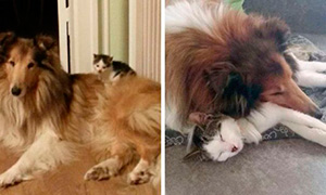 Познакомься с колли по имени Молли и котом, которого она "усыновила" с самого детства.