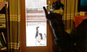 Собака Рики научилась открывать и закрывать входную дверь и теперь может впускать домой еще одного пушистого жильца - кошку.