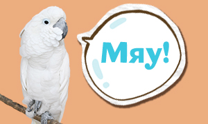 Попугай, живущий в одном доме с кошками научился мяукать и пытается разговаривать с ними на одном языке.