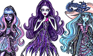 Иллюстрации с Дракулаурой, Вандалой, Ривер, Киёми и Спектрой в стиле набросков дизайнера моды.