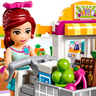 В этот набор входит целых две фигурки: фигурка Мии в роли покупателя и фигурка Даниэля - продавца. Чего только нет в этом наборе Лего: и корзинка для продуктов, и касса, и отдел с булочками и пончиками, и овощной отдел, и стеклянные входные двери, и стенд с прессой! Мия точно не уйдет без покупок.
