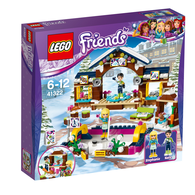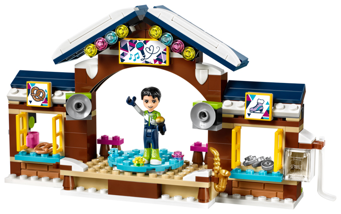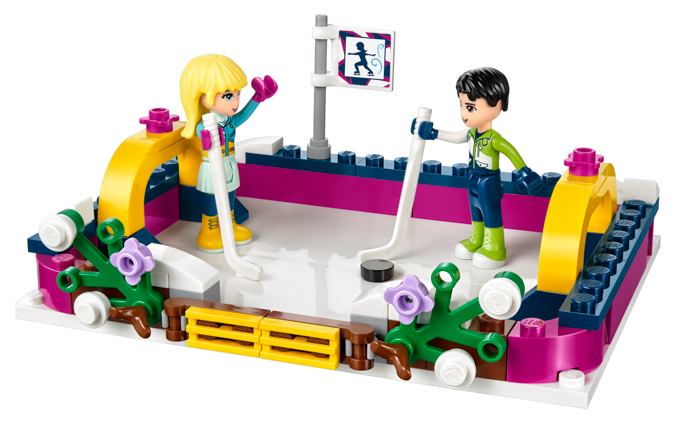 Стефани и ее друг Нейт отправляются на каток на горнолыжном курорте LEGO Friends «Горнолыжный курорт: каток»! Вместе они покатаются и хорошо повеселятся, а потом Нейт сыграет на саксофоне со сцены. После его выступления друзья отдохнут за столиком, перекусят солеными крендельками и поиграют с милым кроликом. А вечером они установят на льду хоккейные ворота и устроят забавные соревнования!