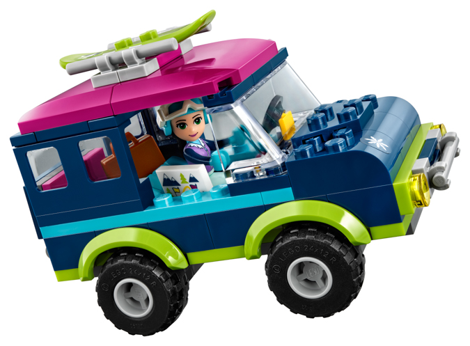 Эмма закрепляет свой сноуборд на крыше внедорожника LEGO Friends «Горнолыжный курорт: внедорожник» и проверяет, не забыла ли она положить в багажник свой чемодан. Все готово – остается только найти на карте лучшие места для катания и отправиться в путь! Вот девушка подъехала к рампе для выполнения различных трюков и рейлу для скольжения. Веселая спортсменка надевает шлем и начинает тренироваться.