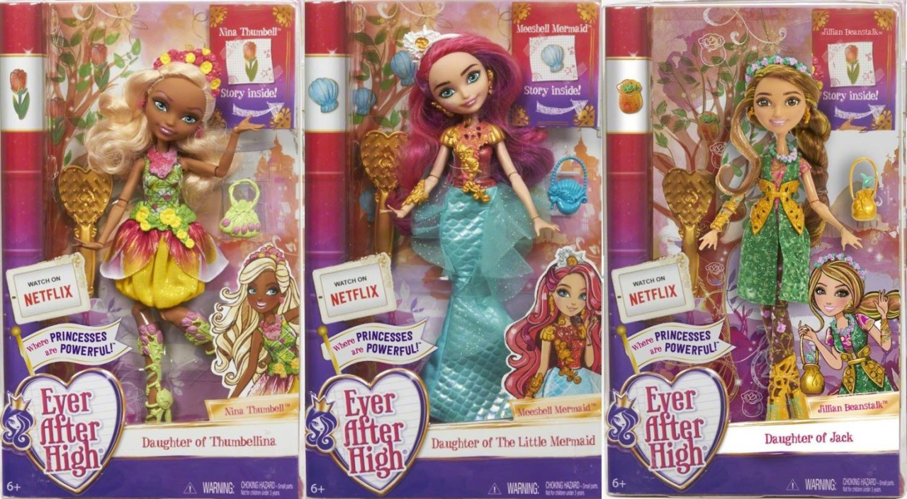 Другие не менее интересные куклы - это базовые куклы новых персонажей: Нины Тамбел (Nina Thumbell) - дочери дюймовочки, Мишель Мермейд (Meeshell Mermaid) - дочери русалочки, Джилиан Бинсток (Jillian Beanstalk) - дочери Джека (Джек и бобовый стебль).