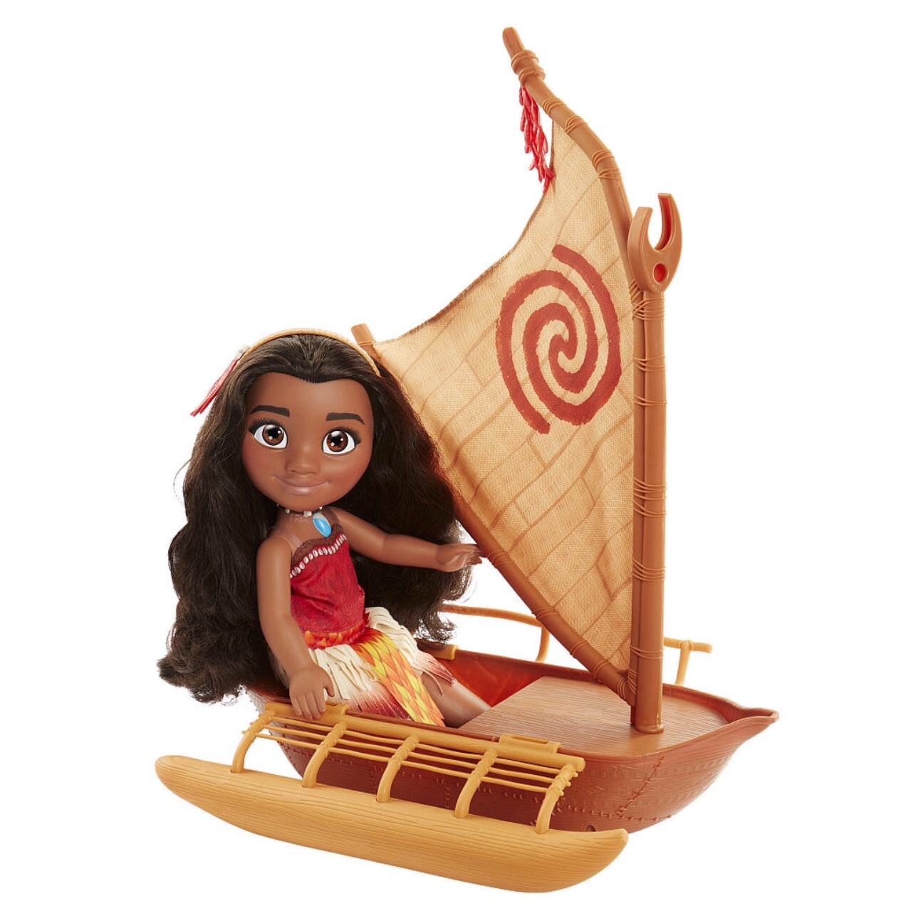 Компания Дисней выпускает две очень красивые куклы этой новой героини: классическую с веслом и поющую, с двумя вариантами наряда, фигурками питомцев и даже светящейся в темноте подвеской.