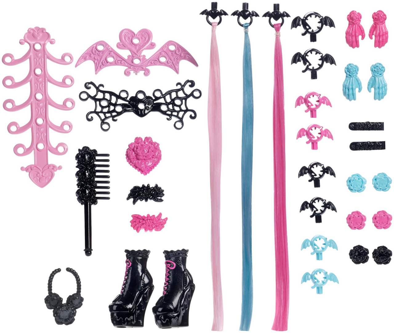 С куклой идет огромное количество различных украшений, дополнительных прядей и аксессуаров для создания безграничного количества новых причесок.