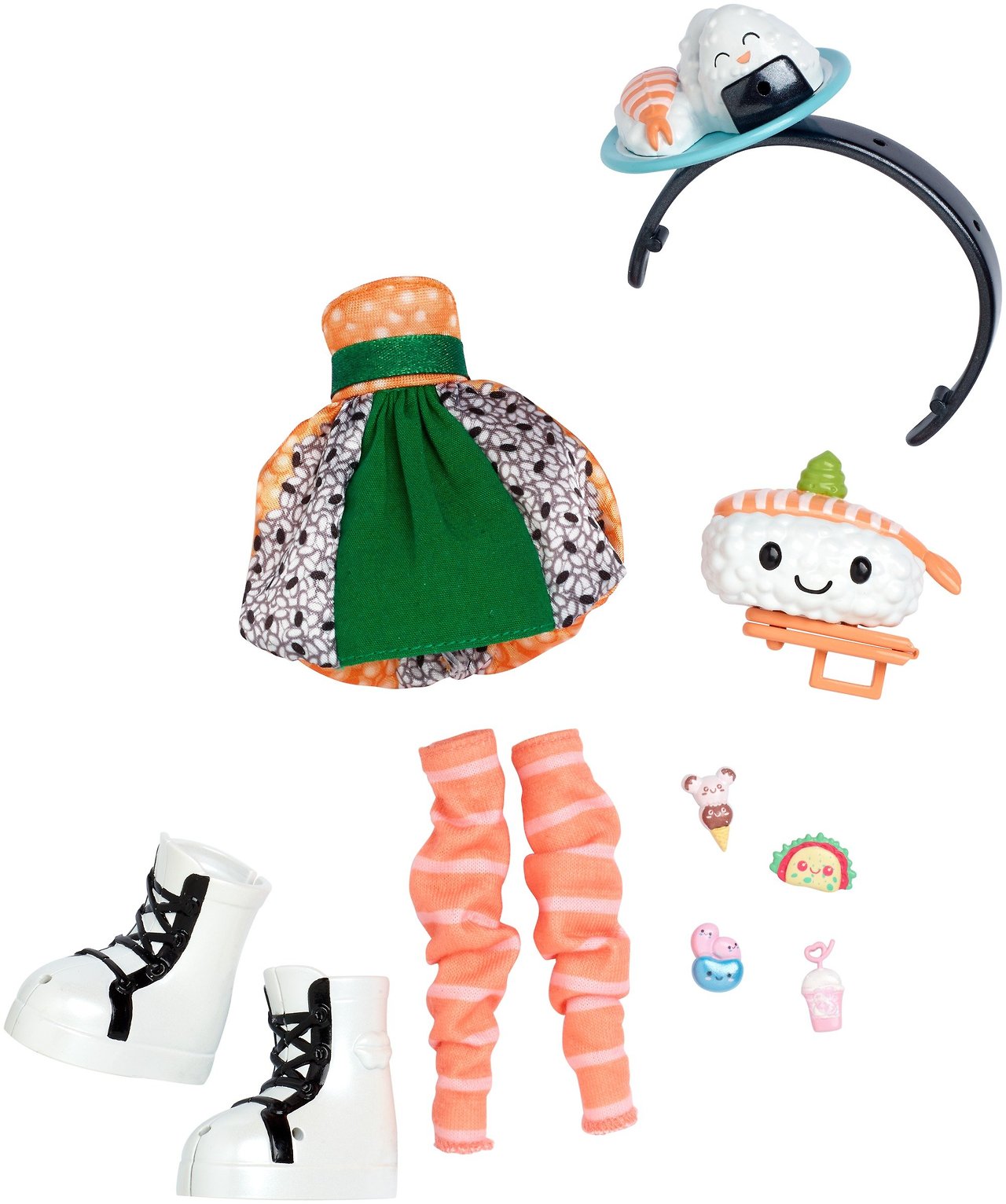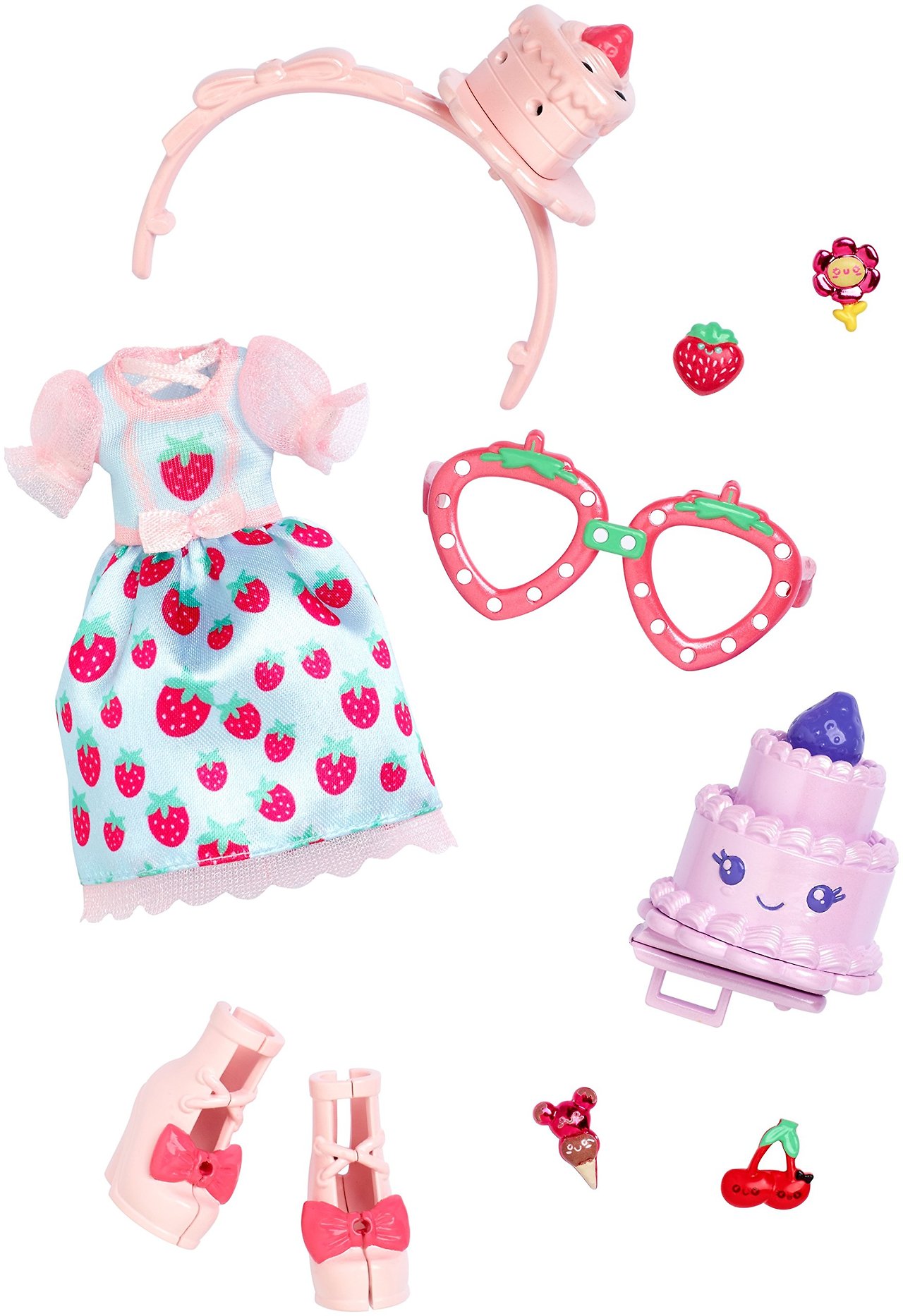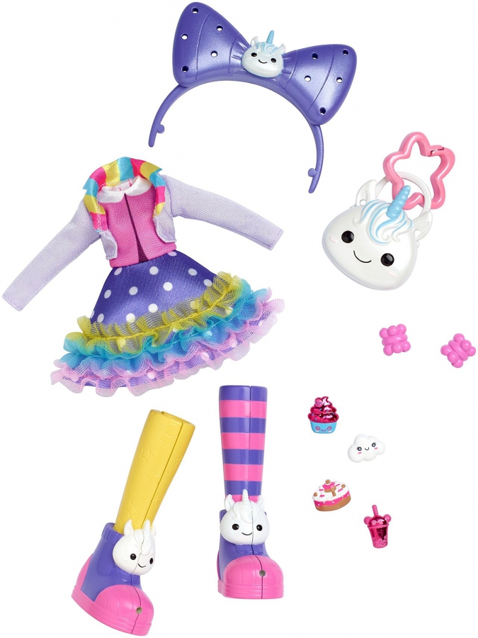 Появились фотографии новых ярких фэшн наборов для кукол KuuKuu Harajuku. Среди одежды, обуви и аксессуаров для куклы есть также один аксессуар для хозяйки куклы: брелок или заколка. Куклы на фото представлены для примера, продаваться они будут отдельно.