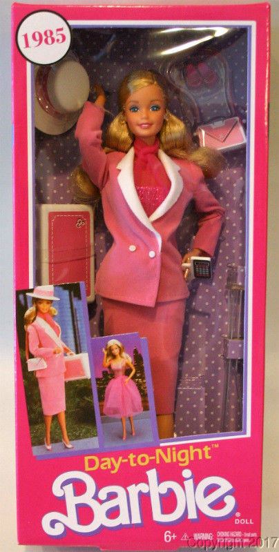 Еще одна радость для коллекционеров, которая должна стоить уже не так дорого как лимитированная кукла Дисней Принцессы. В этом году Маттел выпускает еще одну репродукцию своей успешной куклы, на этот раз куклы Day-To-Night Барби. Эта Барби была выпущена в 1985 году. Благодаря своим нарядам и аксессуарам, Барби легко превращается из бизнес леди в леди, наслаждающуюся вечером в дорогом ресторане или на прогулке. Т.е. она легко меняет дневной образ на вечерний.
