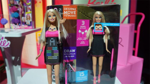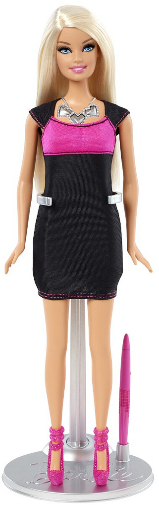 Barbie Digital Dress - именно так называется новая модель куклы Барби 2013 года. Главная отличительная особенность куклы в ее необычном платье. Дело в том, что используя последние LED технологии создатели платья сделали его визуально динамичным и реагирующим на звуки в комнате. У платья три режима, каждое из которых запускается путем нажатия на одно из сердечек на шее Барби. Первое это просто меняющиеся светящиеся картинки, второй режим позволит тебе рисовать на платье любой узор и он будет также ярко светится, а в третьем режиме платье реагирует на звуки в комнате и заупскает картинки в нужном темпе.