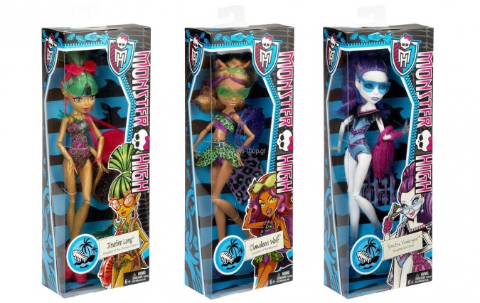 На фотографиях уже можно рассмотреть замечательные полупрозрачные аксессуары монстряшек в виде очков в оригинальной оправе и сумочек, а также сережек. Туфельки у кукол также сделаны из цветного полупрозрачного пластика. Ну и конечно же с каждой куклой идет в комплекте красивое пляжное полотенце.