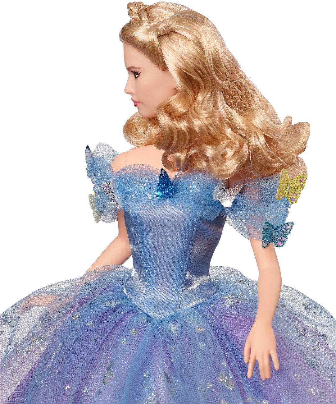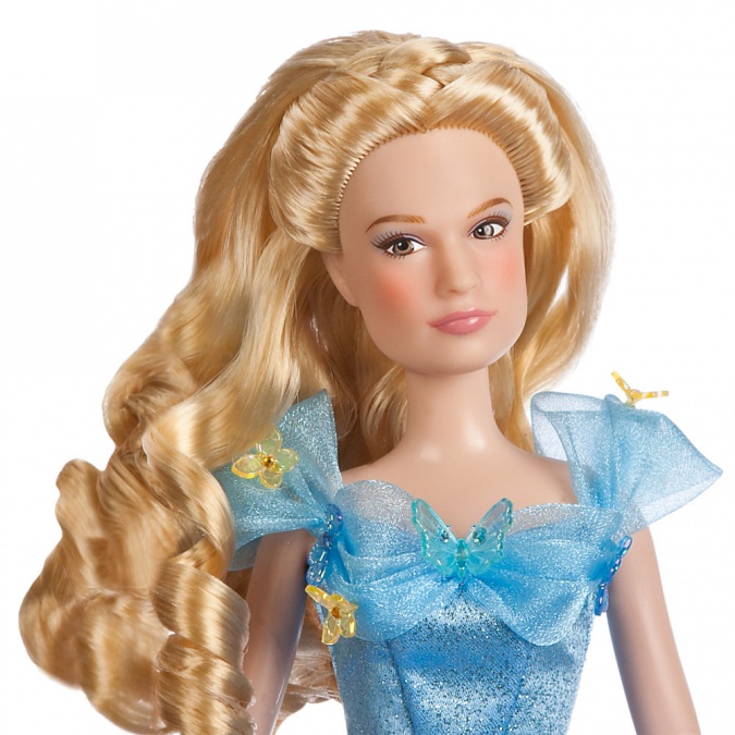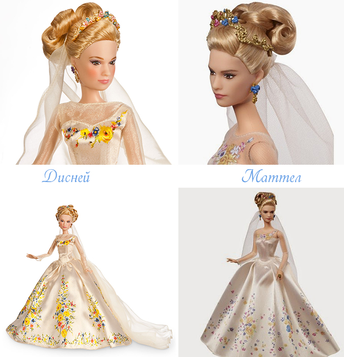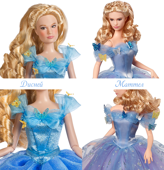 Так, например бабочки на платье Золушки в версии Дисней судя по всему сделаны из пластика, тогда как Маттел предпочел более мягкий материал. Очень важное отличие для многих - наличие шарниров в локтях у куклы Золушки от Дисней. Зато лицо (хотя это зависит от личных предпочтений) у куклы от Маттел может показаться более женственным. Маттел также добавил в прическу куклы блестящие пряди.