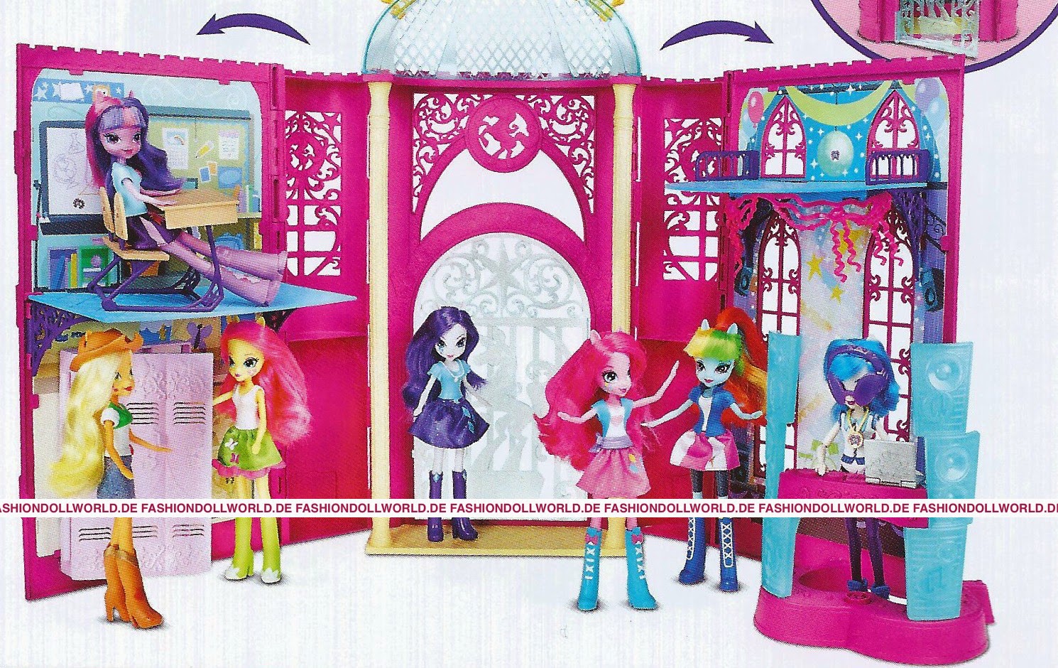 Начнем с игровых наборов. Встречай раскладывающийся игровой набор школы Кантерлота, в котором отведено место для учебы, шкафчики для учеников и даже диджейский пульт Винил Скретч.