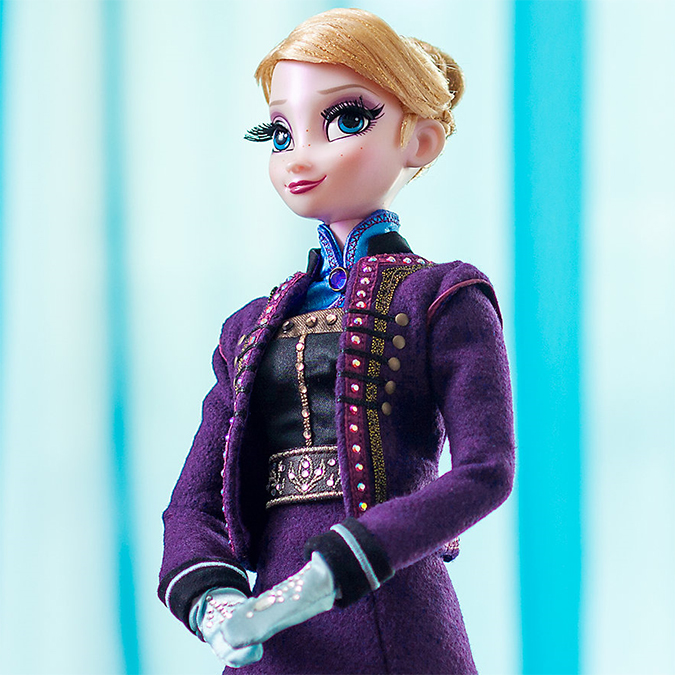 Начнем (конечно же) с новой куклы Эльзы. На этот раз кукольные дизайнеры нарядили её в костюм, в который она носила перед отъездом родителей. Поэтому в этой версии Эльзы с ног до головы одета в пурпурного цвета вельветовую ткань с замечательной вышивкой. И вышивка и аппликации, и сама ткань, - все на высшем уровне.