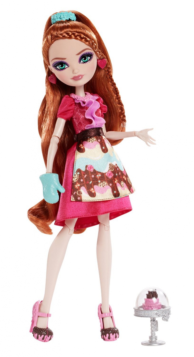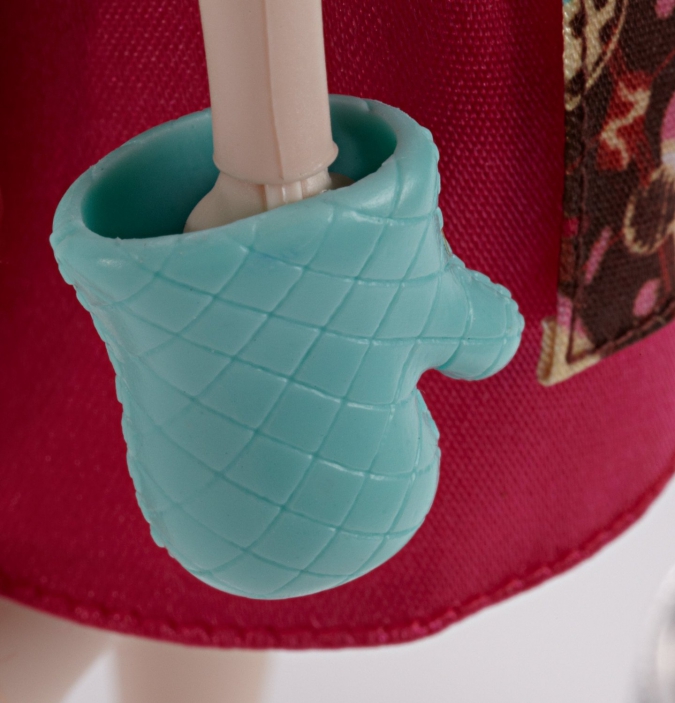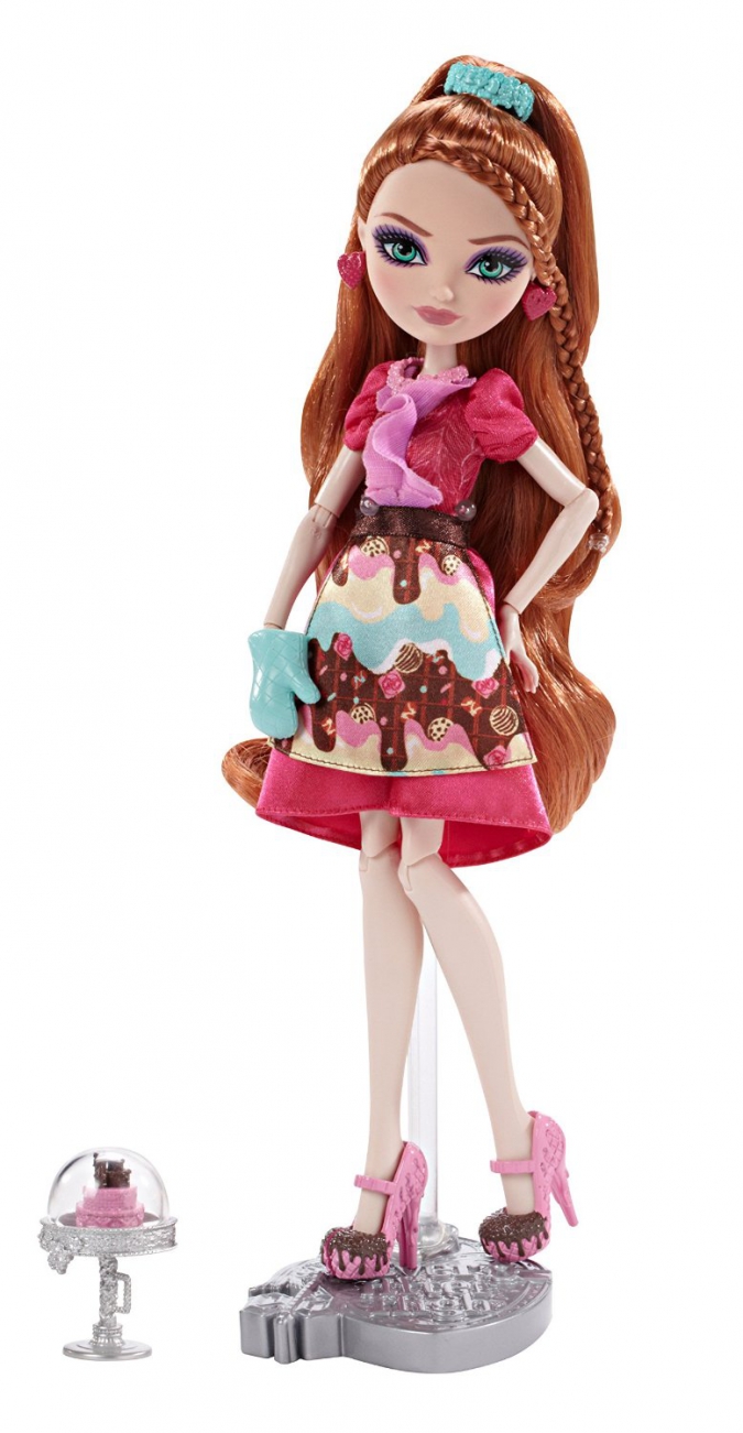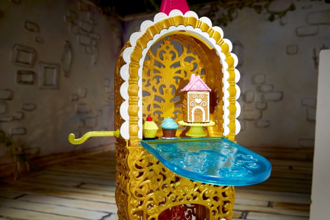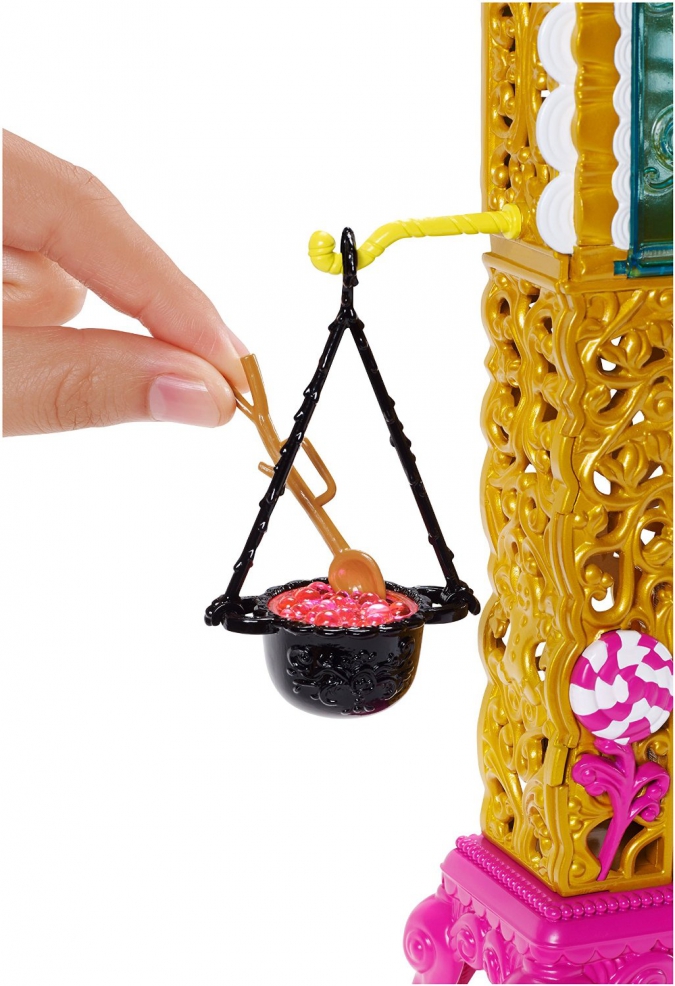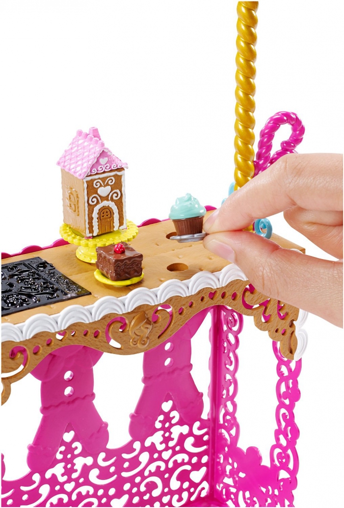 А в месте с самой Джинджер Брэдхаус идет шикарный игровой набор с печкой (в которой можно расставить десерты), бурлящим котелком и лопаткой, столом с плитой, стулом, подставкой с наглядными обучающими иллюстрациями, столиком, в котором можно хранить кухонные принадлежности и готовые десерты.