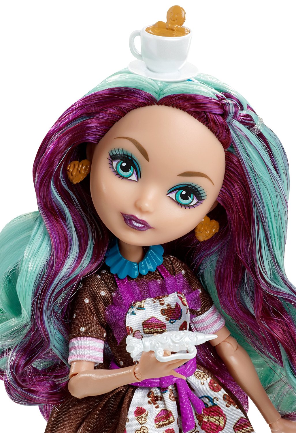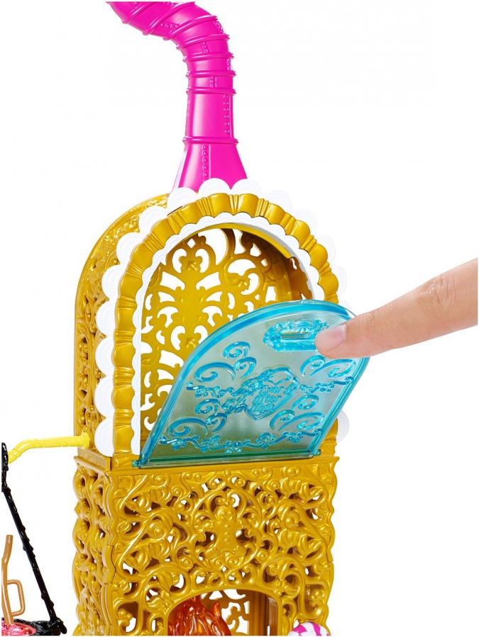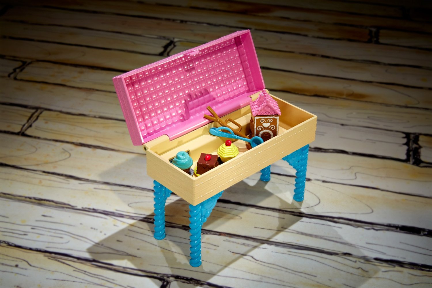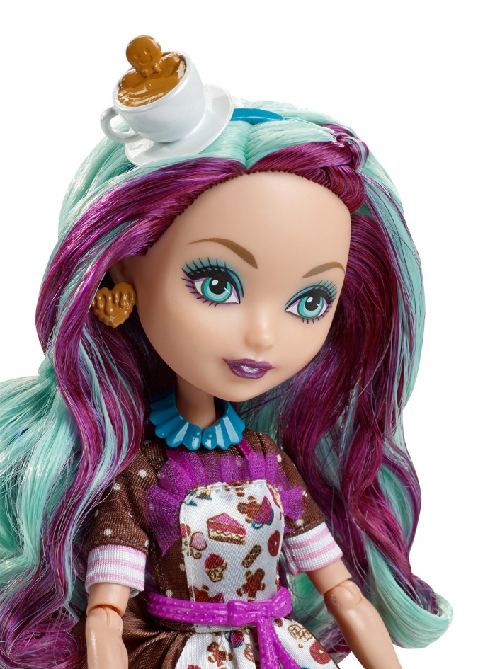 А в месте с самой Джинджер Брэдхаус идет шикарный игровой набор с печкой (в которой можно расставить десерты), бурлящим котелком и лопаткой, столом с плитой, стулом, подставкой с наглядными обучающими иллюстрациями, столиком, в котором можно хранить кухонные принадлежности и готовые десерты.