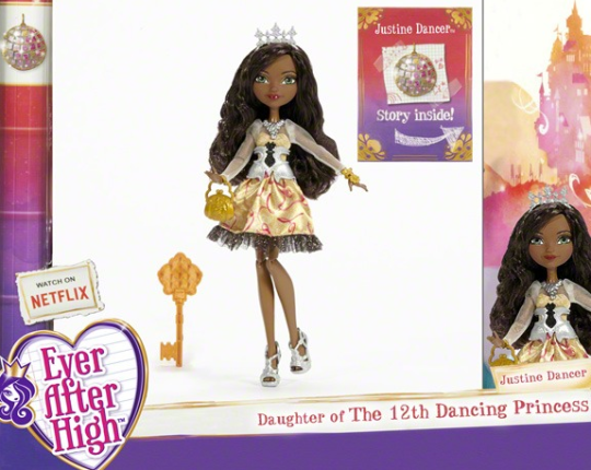 Во-первых стало известно имя и происхождение куклы из этой новости. Ее зовут Джастин Дансер (Justine Dancer ) и она дочка героини из сказки братьев Гримм "Двенадцать танцующих принцесс".