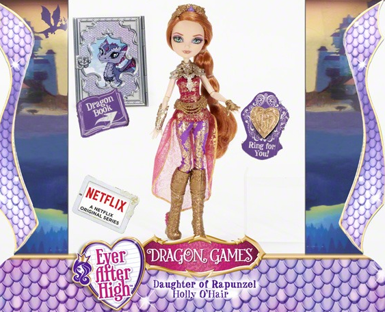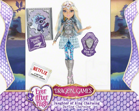 И, наконец, куклы посвященные судя по всеми новому спешалу Dragon Games (Игры Драконов / Игры на Драконах). Все куклы из этой серии одеты в оригинальные наряды, напоминающие рыцарские доспехи. С куклой Эппл даже будет идти дракон в комплекте. Пока что известно что в коллекцию кукол Эвер Афтер Хай Dragon Games войдут Эппл, Рэйвен, Холли и конечно же Дарлинг Чарминг.