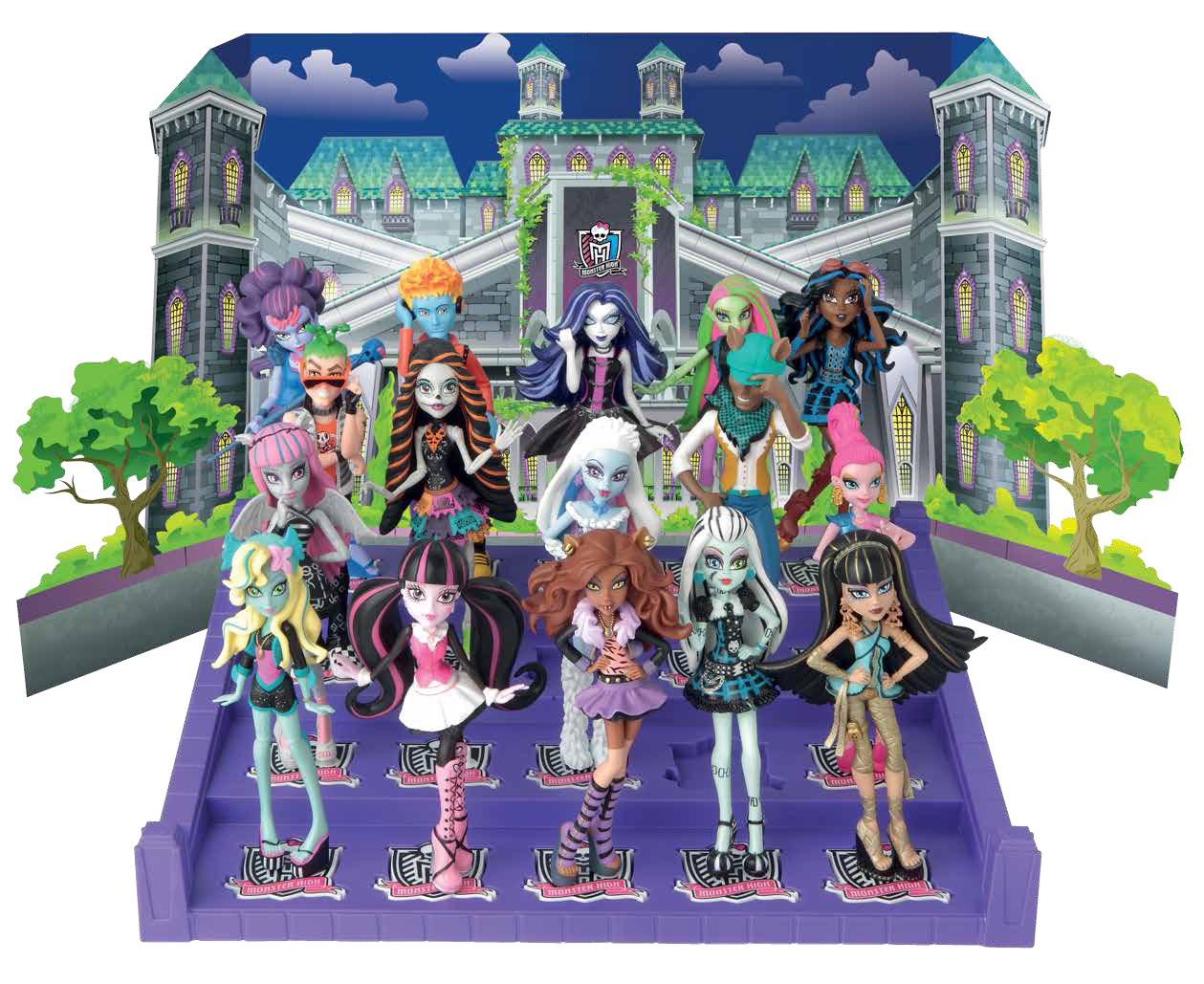 Большие промо картинки сейчас есть только для первых девяти фигурок: Клодин, Дракулауры, Фрэнки Штейн, Рошель Гойл, Клео де Нил, Скелиты Калаверас, Лагуны Блю, Эбби Боминэйбл. На этих промо картинках ты можешь рассмотреть как выглядит фигурка спереди, сбоку и сзади.